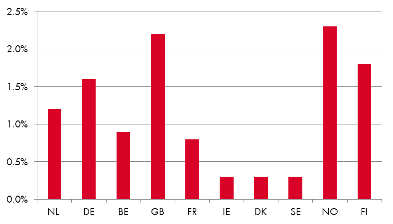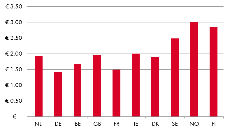 In Germany and France the average parking tariff is 25% respectively 22% below the average of the ten Q-Park countries, while the average tariff in Norway and Finland is 60% and 50% higher, respectively. In the Netherlands, the tariff is more or less at the average level.